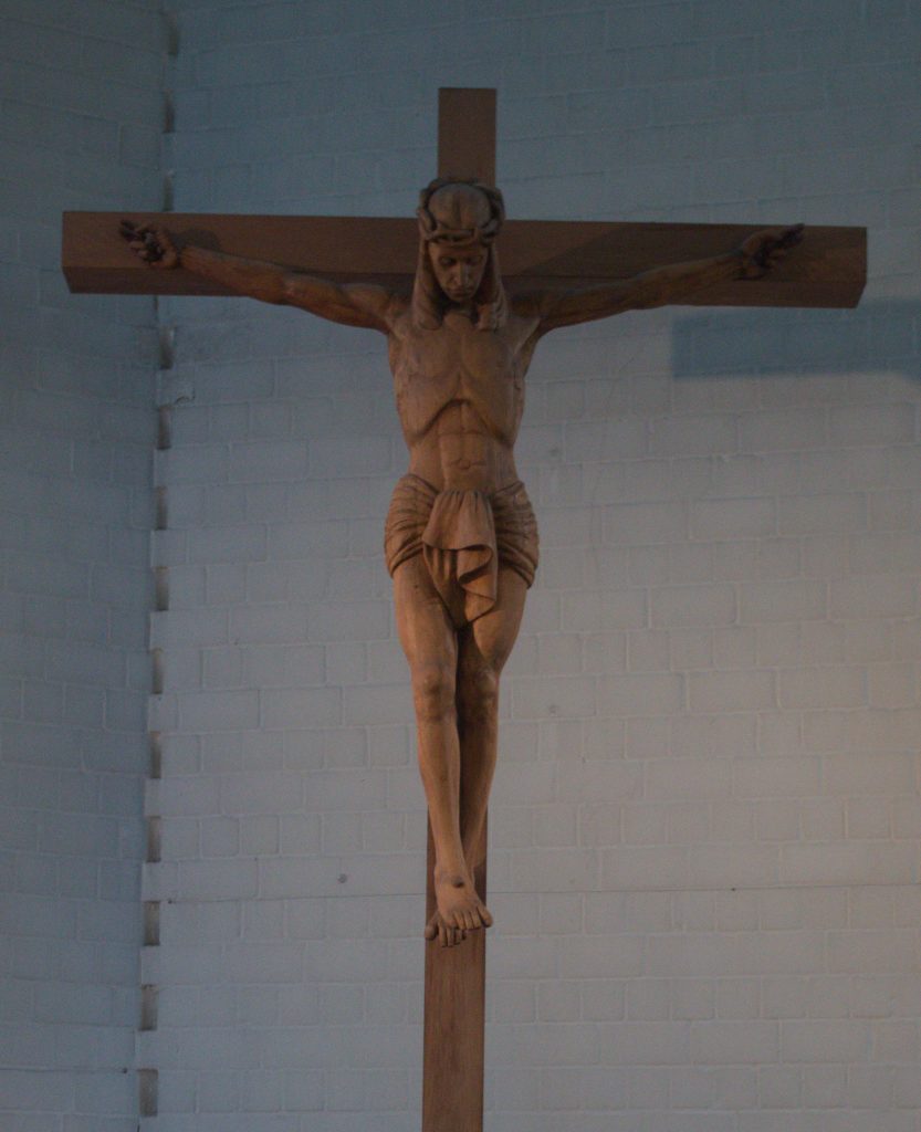 Im Altarraum unserer Kirche ist ein 4,30 Meter hohes Standkruzifix errichtet. Der Korpus dieses Kunstwerkes ist eine Arbeit des Berliner Künstlers Ernst Gustav Jägers (1880 – 1954). Der Korpus wurde 1947 aus Linden- und Erlenholz erschaffen. Vermutlich war es eine Auftragsarbeit des damaligen Leiters der inneren Mission, Pastor Theodor Wenzel (1895 – 1954). Im Jahr 1960 wurde das Kruzifix dem geistlichen Direktor des Central-Diakonissenhauses-Bethanien in Berlin-Kreuzberg, Pastor Martin Schaaf, für die Anstalt übergeben. Das Kruzifix wurde in einer Nische der Vorhalle des Bethanien aufgestellt und man konnte dort in stiller Andacht verweilen. Nach dem Verkauf des Bethanien im Jahr 1969 wurde das Kruzifix in der benachbarten Ev. St. Thomas-Kirche eingelagert. Als im Jahr 1989 für St. Thomas eine Asbestsanierung anstand, wurde das Kruzifix in einen Lagerraum des Ev. Konsistoriums überführt. In dieser Zeit wurde in unserer Gemeinde angefragt, ob wir dieses Kruzifix als Dauerleihgabe in unserer Kirche aufstellen möchten. Der damalige Gemeinderat hat dieses Angebot dankbar angenommen. Unter künstlerischer Fachaufsicht wurde das Kruzifix in der alteingesessenen Tischlerei Kienitz in Berlin-Wedding restauriert und ein neues Kreuz angefertigt. Um das Kruzifix sicher aufzustellen, wurde im Altarraum ein aufwendiges Fundament gebaut. Am Karfreitag 1990 wurde das Kruzifix in einem feierlichen Gottesdienst aufgestellt.